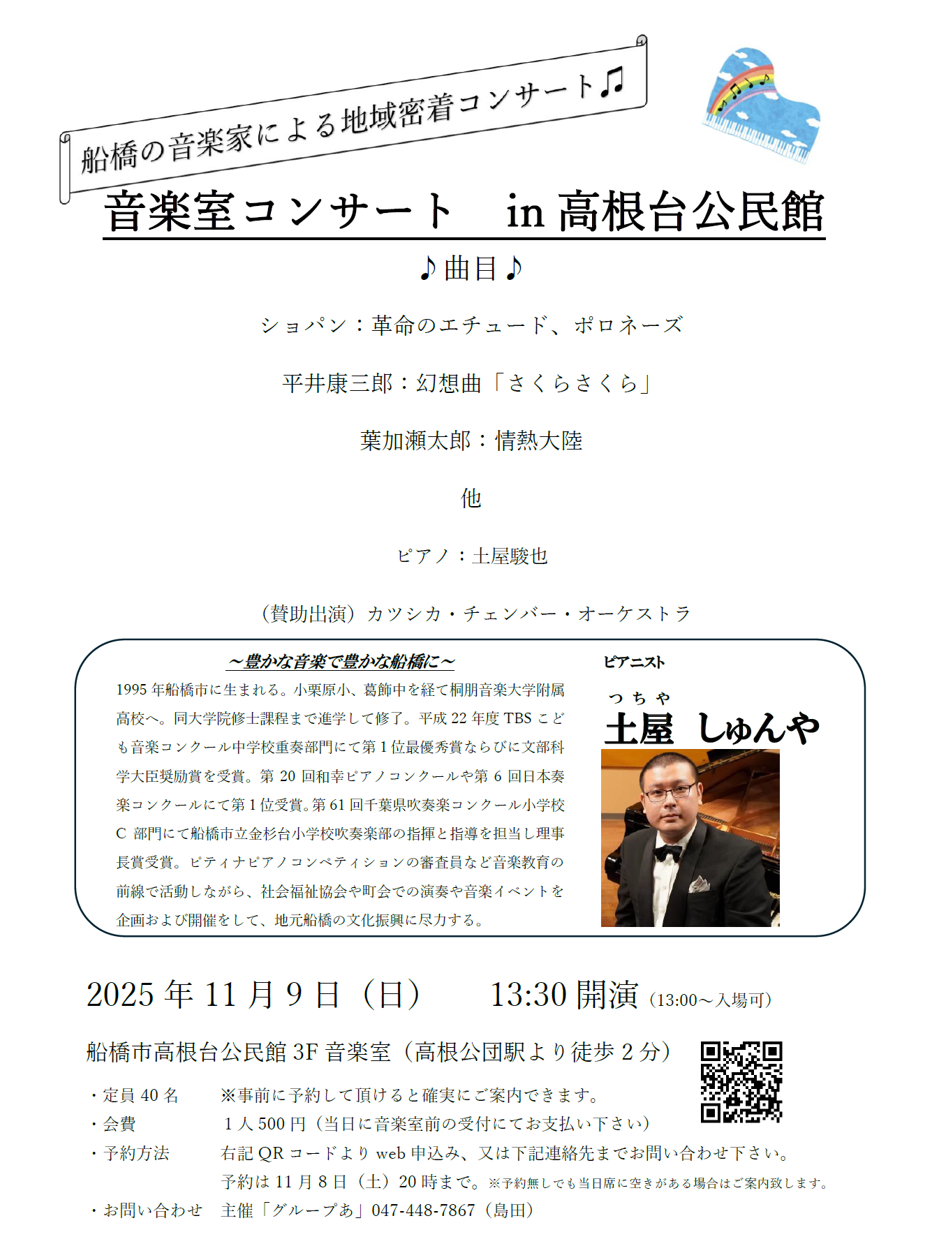 Home › › 音楽室コンサート(写真) 2025-09-29 音楽室コンサート(写真) 関連記事 ムジカノーヴァにインタビュー記事が掲載されました 2台ピアノコンサートでした 第5回虹音フェス ご参加の皆さまへ 第5回虹音ミュージックフェスティバル無事に終演 ピティナ・ピアノステップ 尾張東地区のアドバイザーへ 音楽室コンサートin高根台公民館 開催のお知らせ